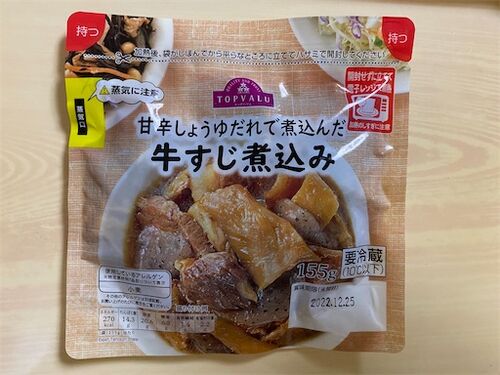 結果 ありトップバリュ! これは前買ったことあったかな? 「甘辛しょうゆだれで煮込んだ 牛すじ煮込み」 牛メンブレン、こんにゃくが入ってる。 これも皿にあけずにそのままチン。 さらさらの汁ですね。 出しやすくて助かるー。 出来上がり。 こんにゃくx4…